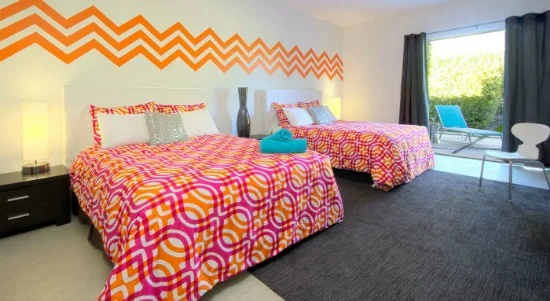 A perfect mix of color and pattern. Our OGEE wall decals, shown here in orange, are featured in the No Reservations PS vacation rental in Palm Springs. Design by Francie Flynn for Acme House Co. Vacation Rentals.
