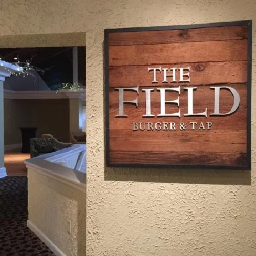 Designed and handmade by us using reclaimed barn wood. The Field Burger & Tap signage. Photo credit: The Field Burger & Tap - State College, PA