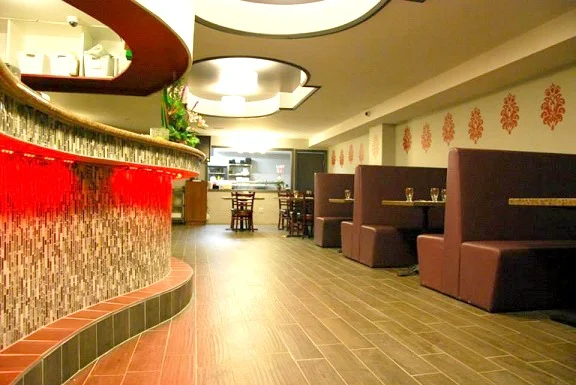 Restaurant decor featuring our damask wall decals in custom dimensions. Shown here in red. Photo credit: Asian Wok 'n' Roll.