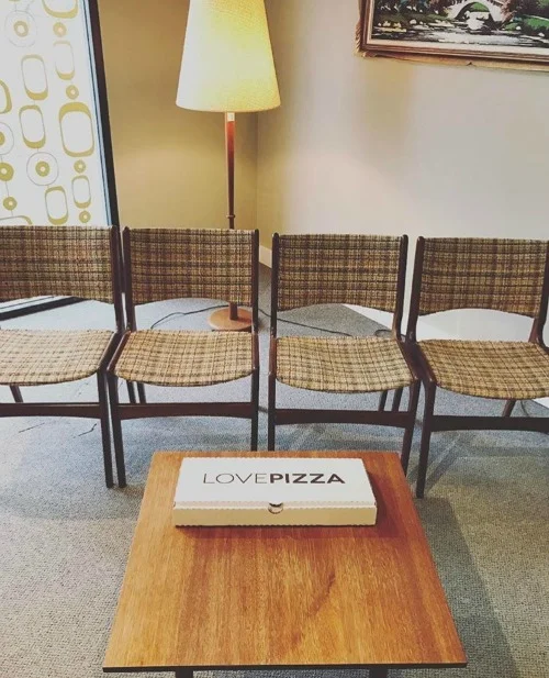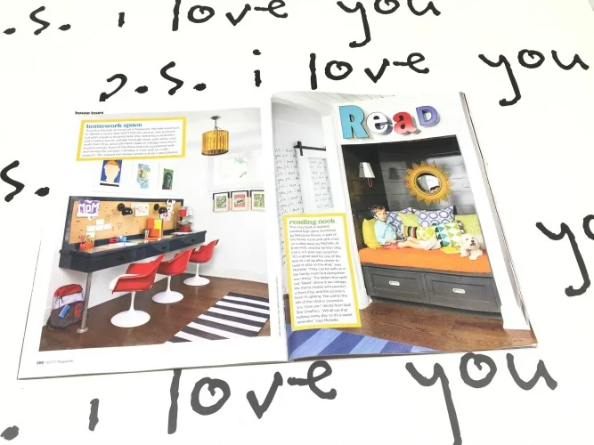 For this project in the Mellow Yellow Butterfly vacation home in Palm Springs, the PS stands for Palm Springs, of course. Our PS I LOVE YOU wall decals are shown in black. Design by Francie Flynn for Acme House Co. Vacation Rentals.